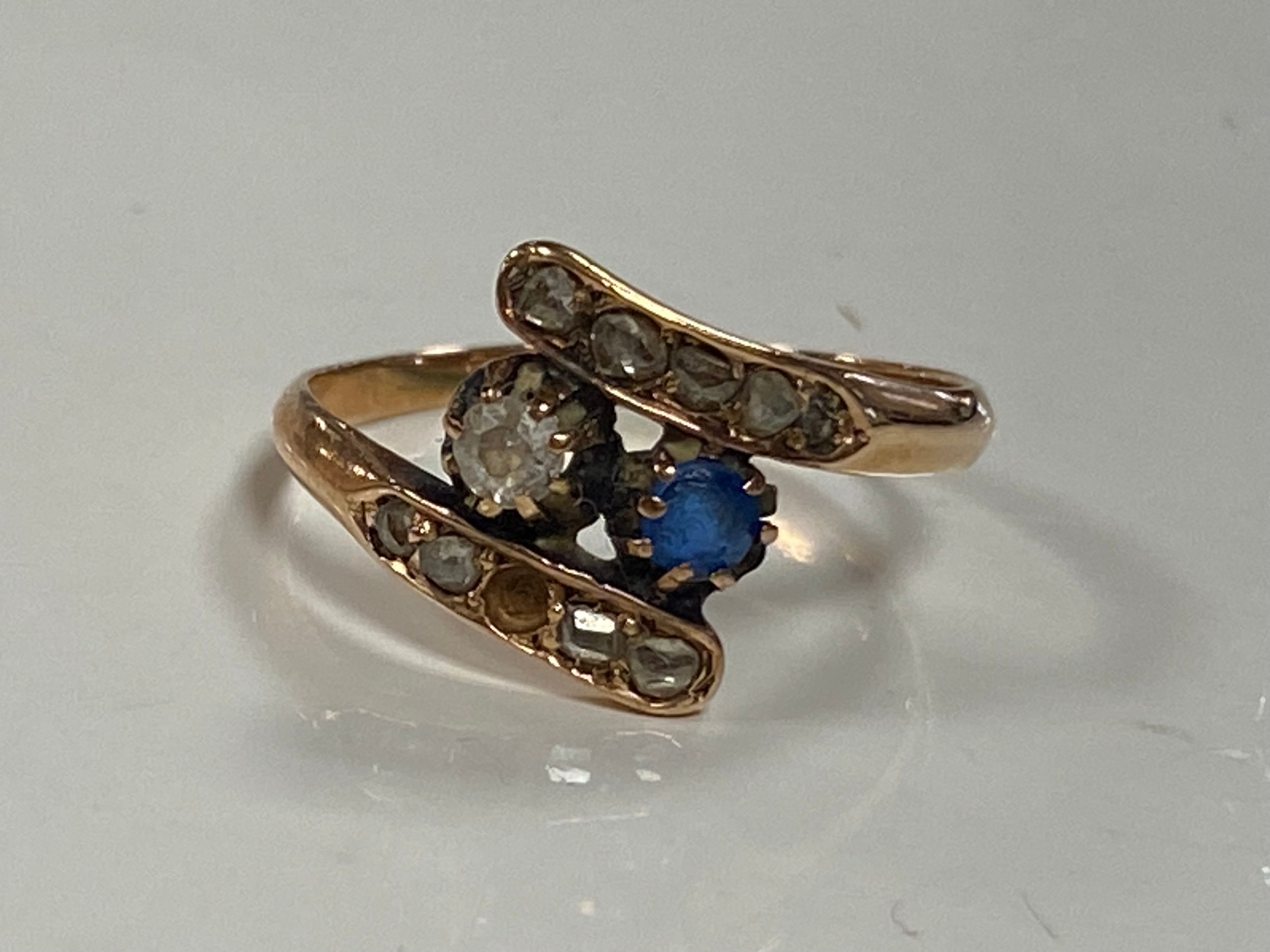 A sapphire and diamond ring, of crossover design, set in yellow metal mount -