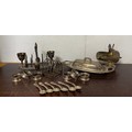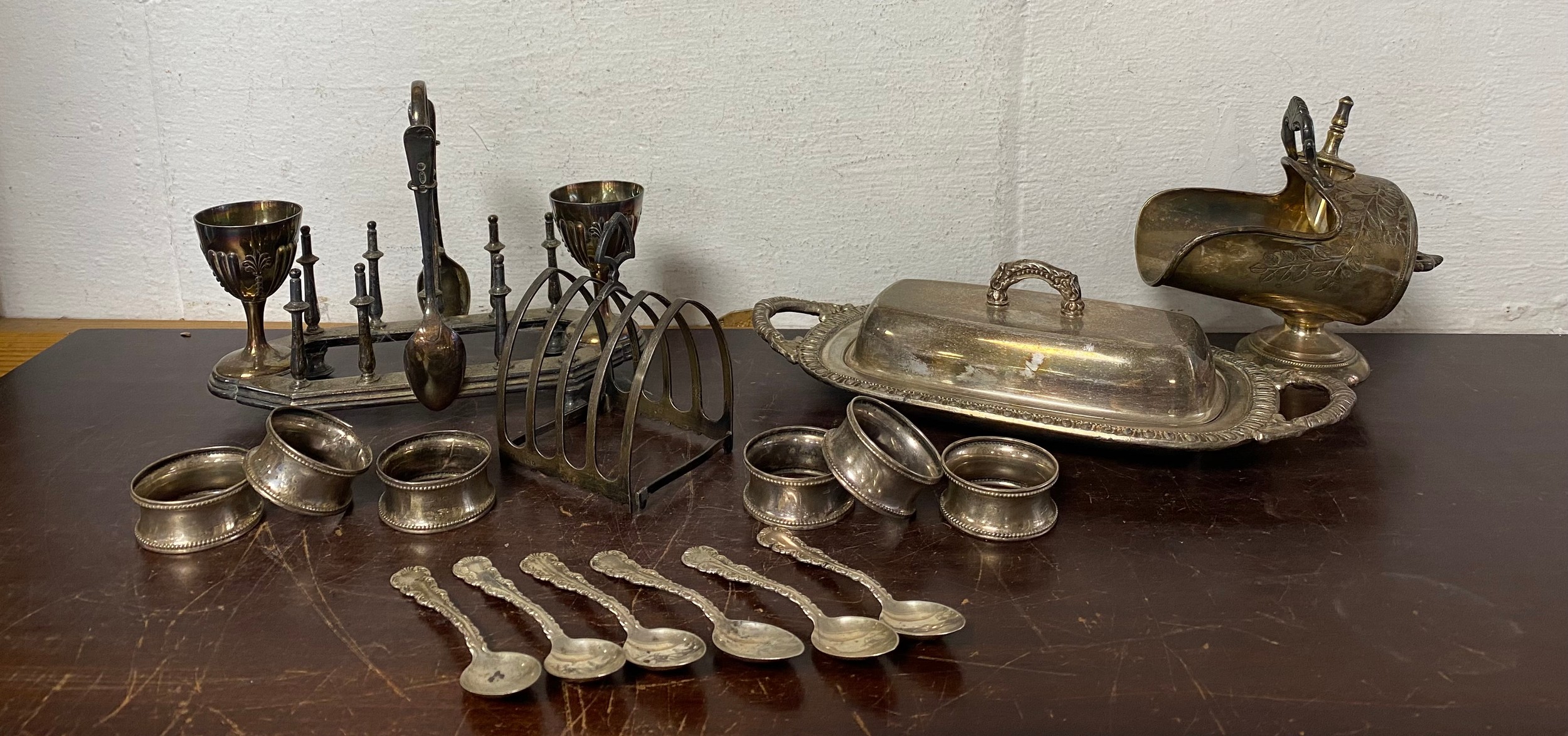 A George V silver toast rack, Birmingham 1929,together with a set of six silver teaspoons, stamped sterling, six silver napkin rings, plated egg cruet, etc -