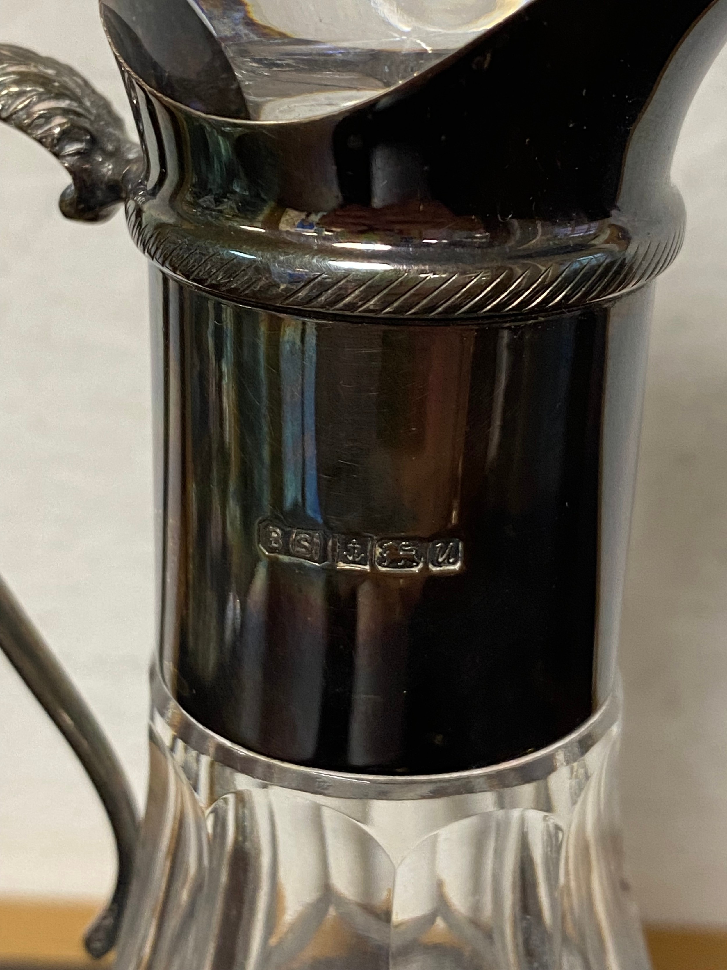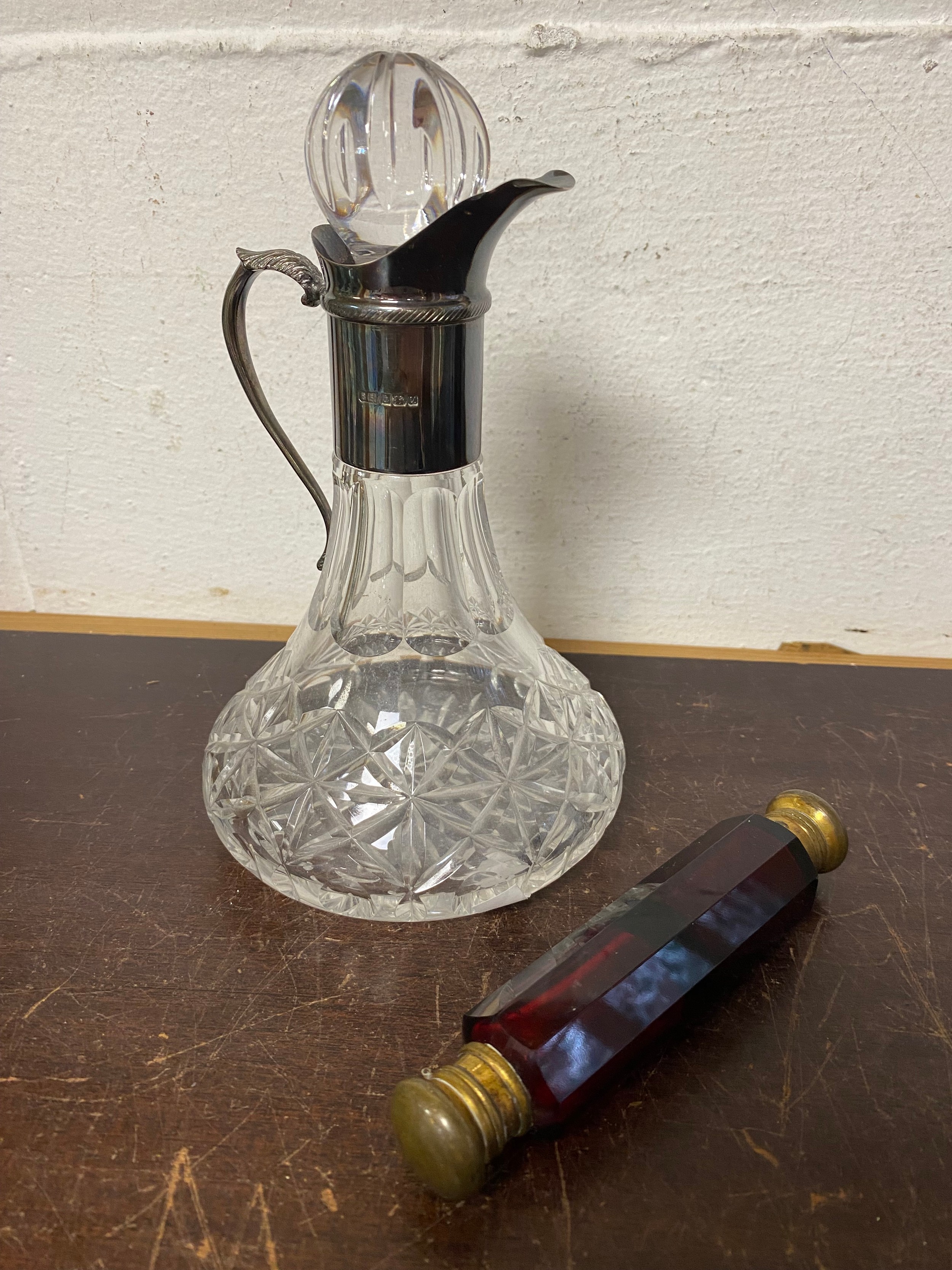 A silver mounted jug, with a ruby glass double ended scent bottle (2) -