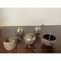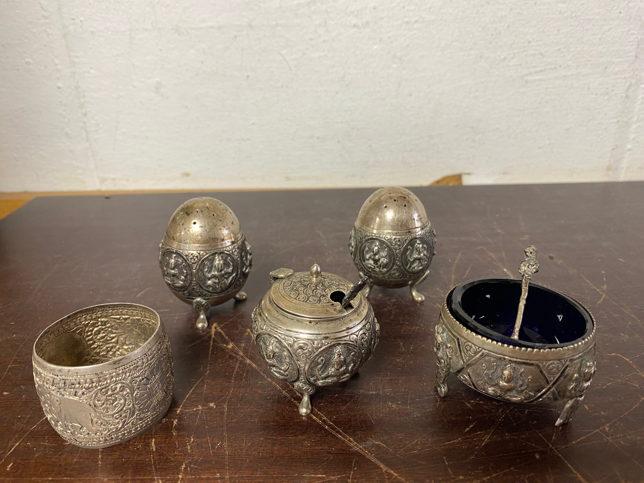 An Eastern white metal three piece cruet, a similar open salt and napkin ring -