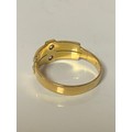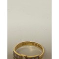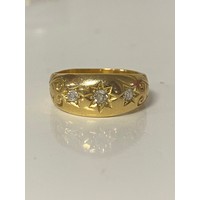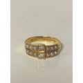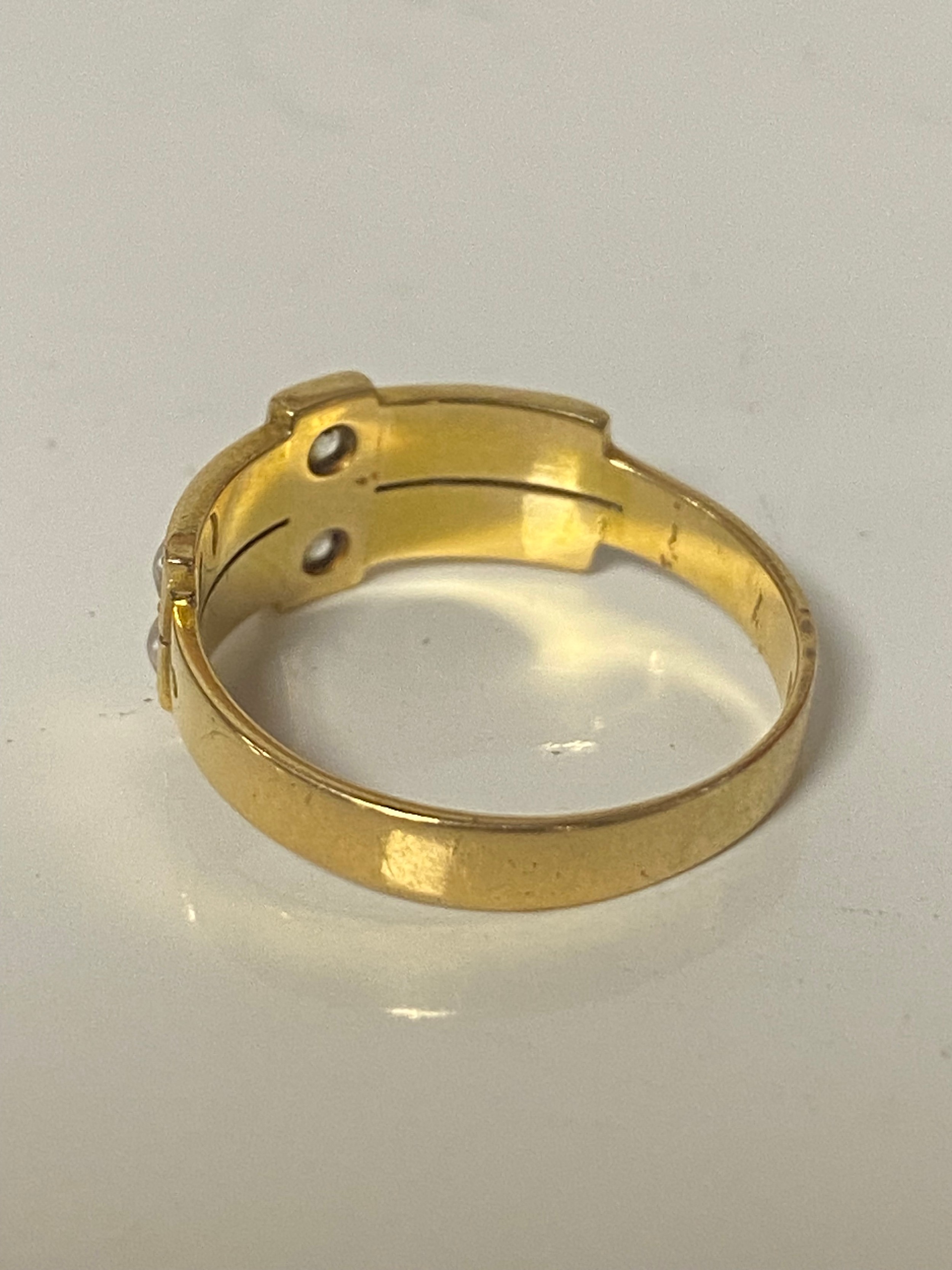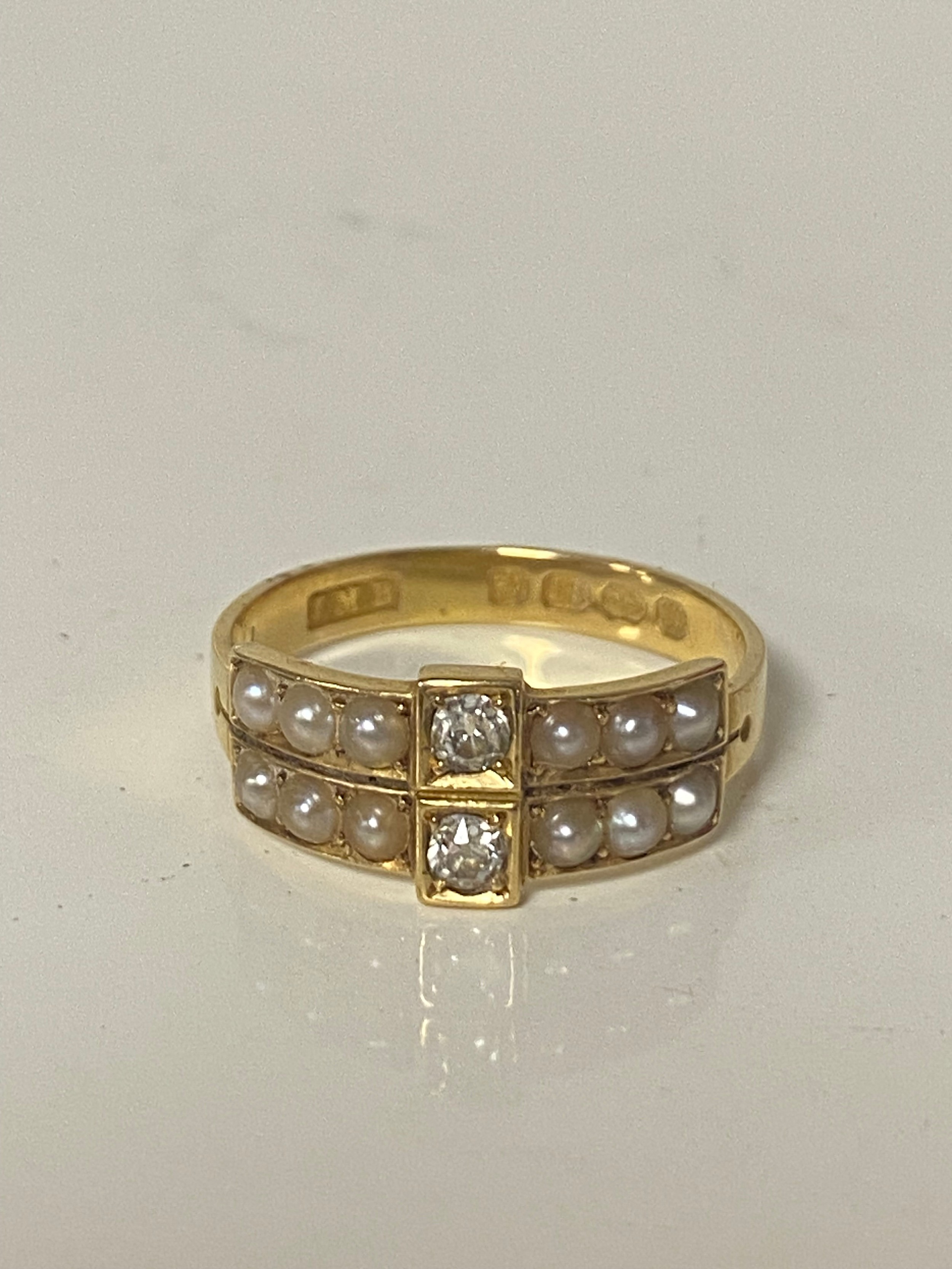 A late Victorian dress ring set with two old cut diamonds vertically set between rows of seed pearls, all set in 18ct gold -