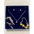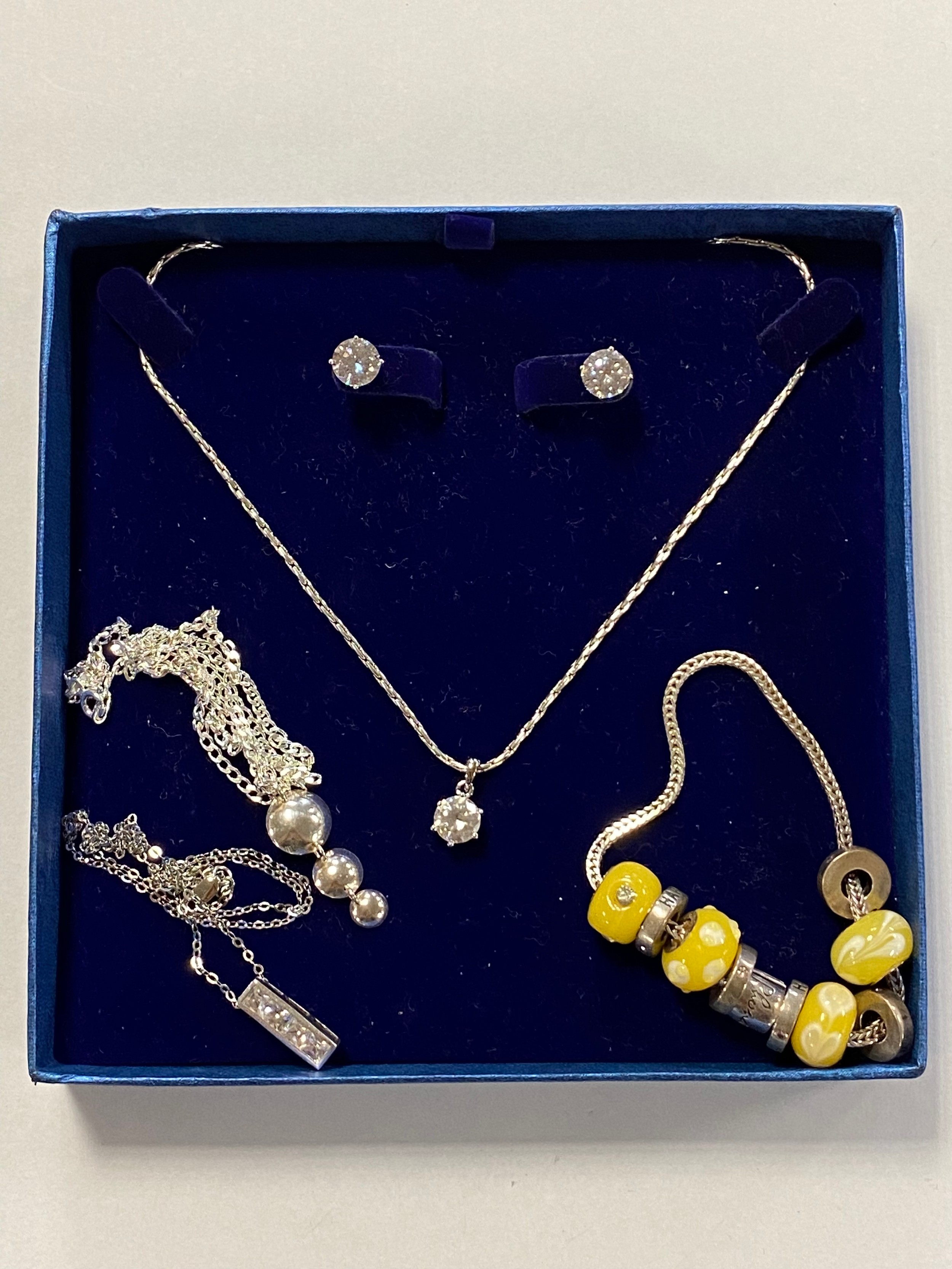 A modern silver and CZ set pendant and earrings, together with two silver pendants on chain and a Rhona Sutton charm bracelet -