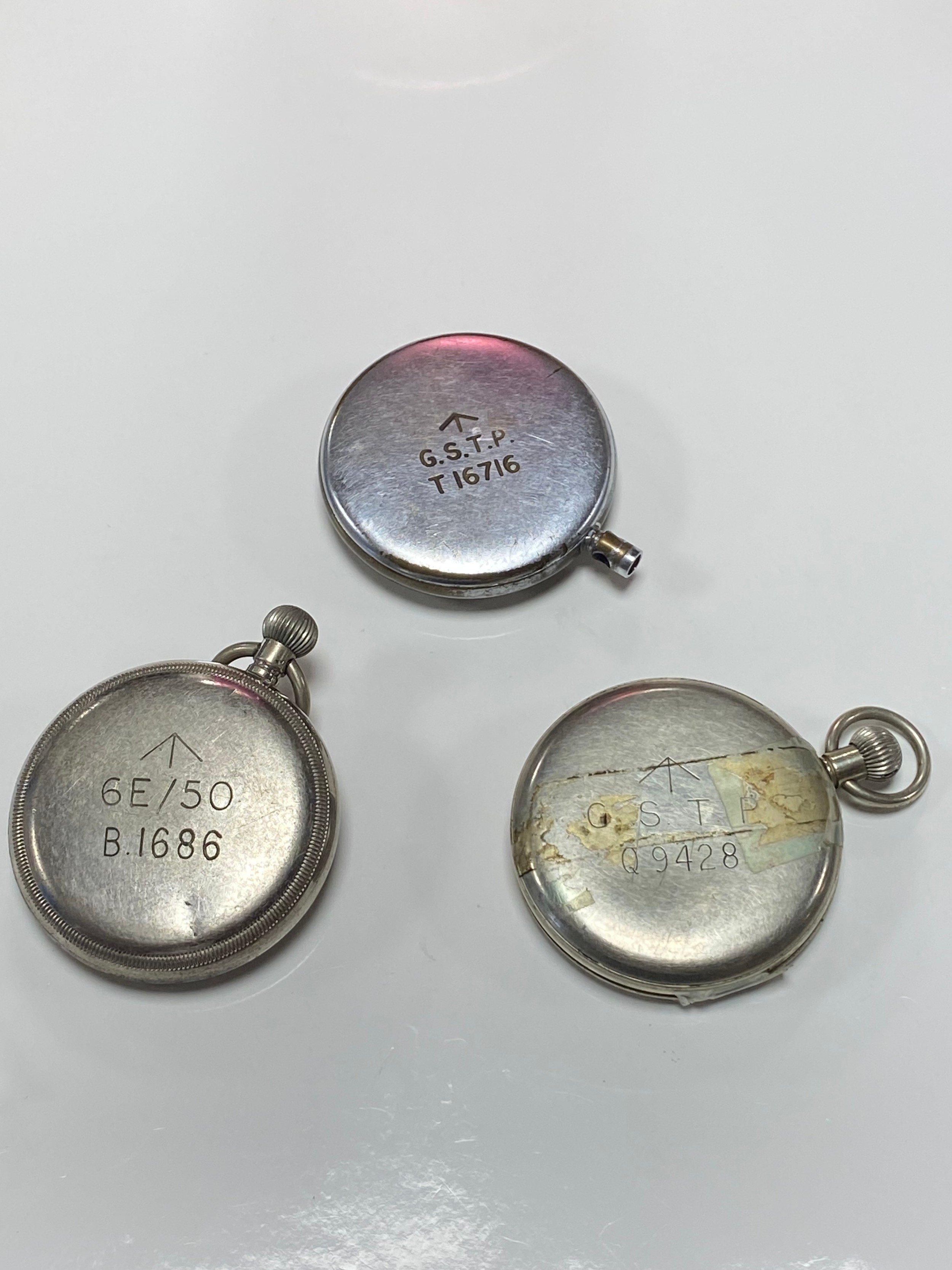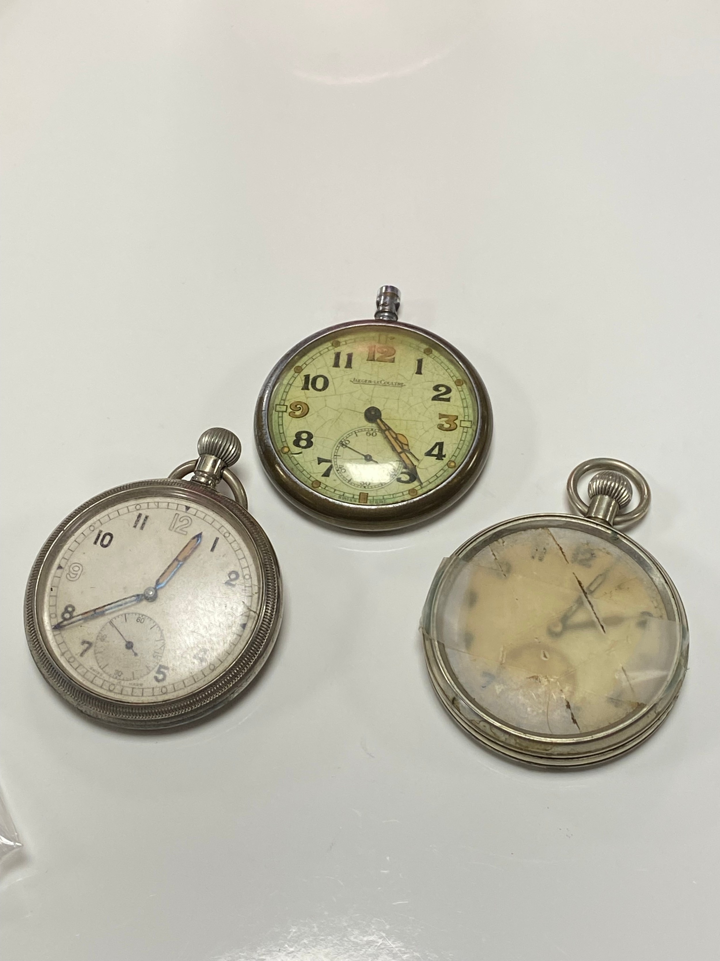 A military issue Jaeger le Coultre open face pocket watch, with subsidiary dial, stamped GSTP & T16716 to reverse, together with two other military issue pocket watches (3) -