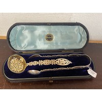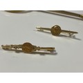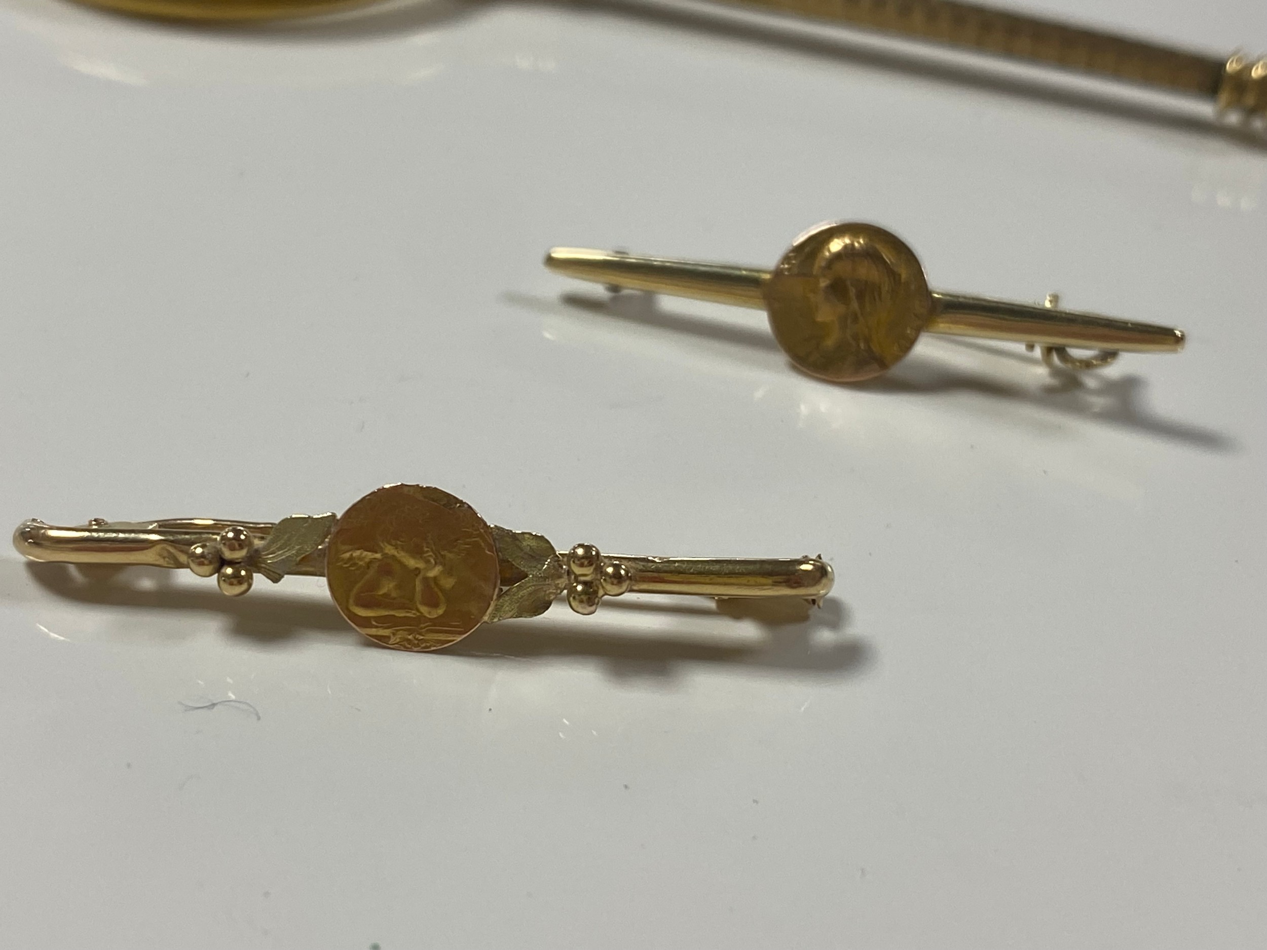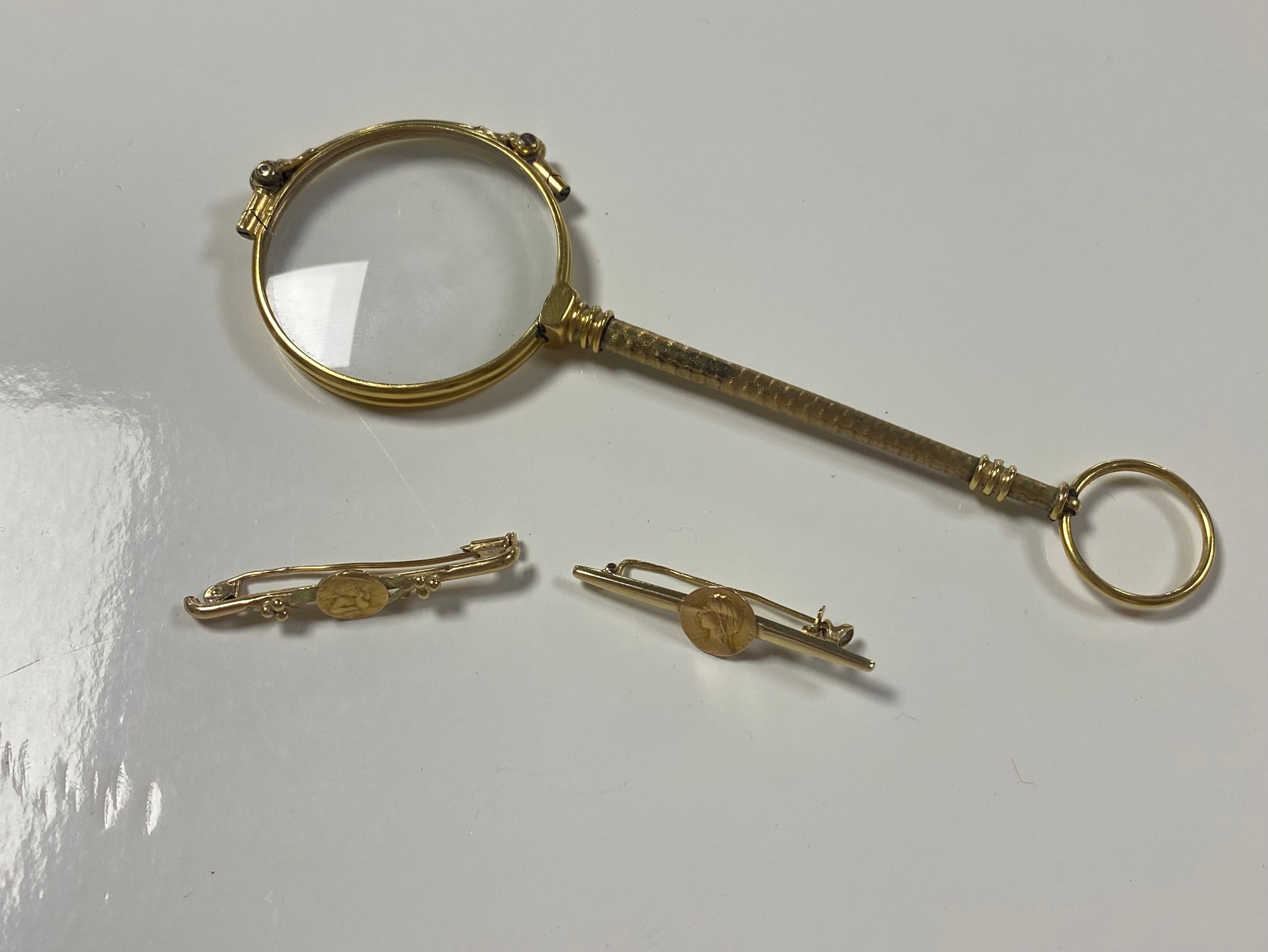 Two French yellow metal bar brooches, each applied with medallions together with a pair of lorgnette -