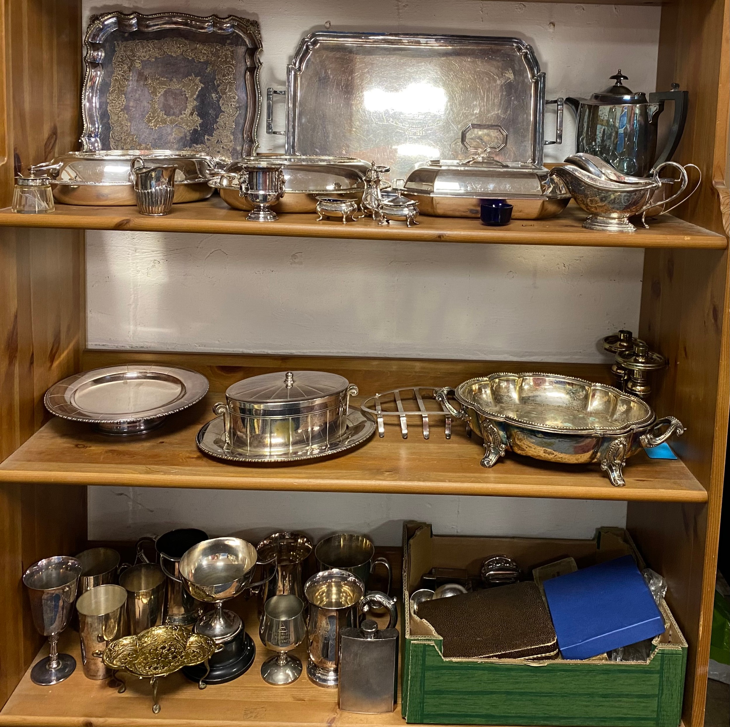 A quantity of silver plated ware, to include oval box, cover and stand and matching tazza, entree dishes, trays, etc -