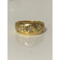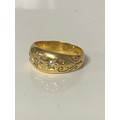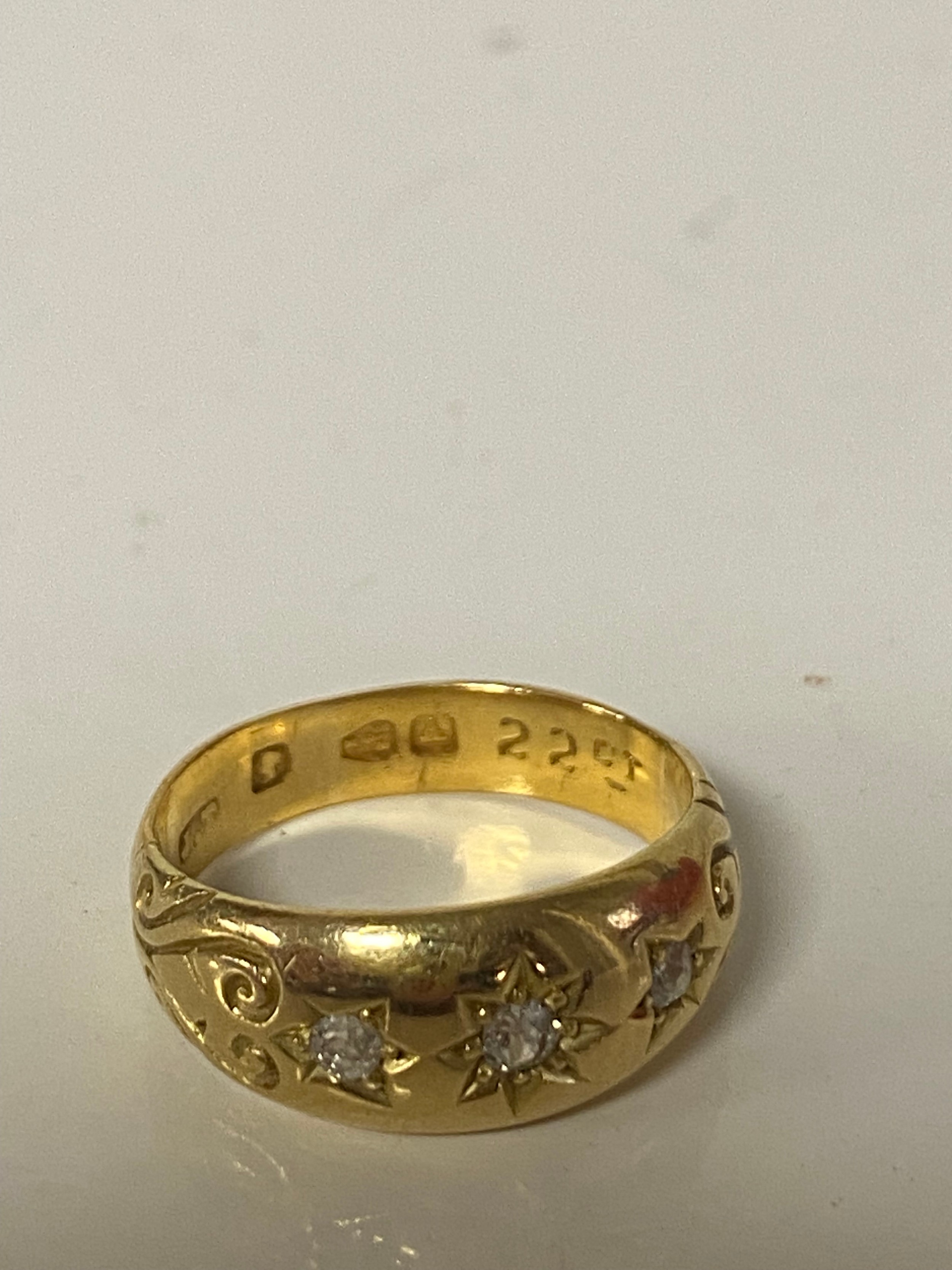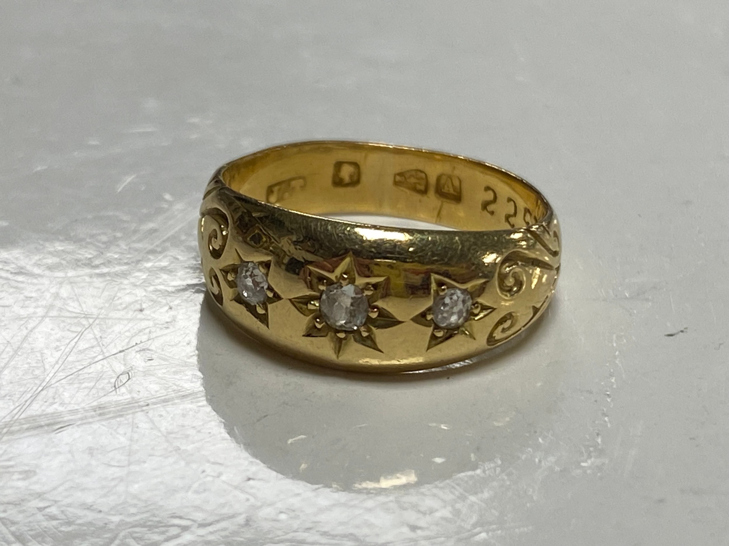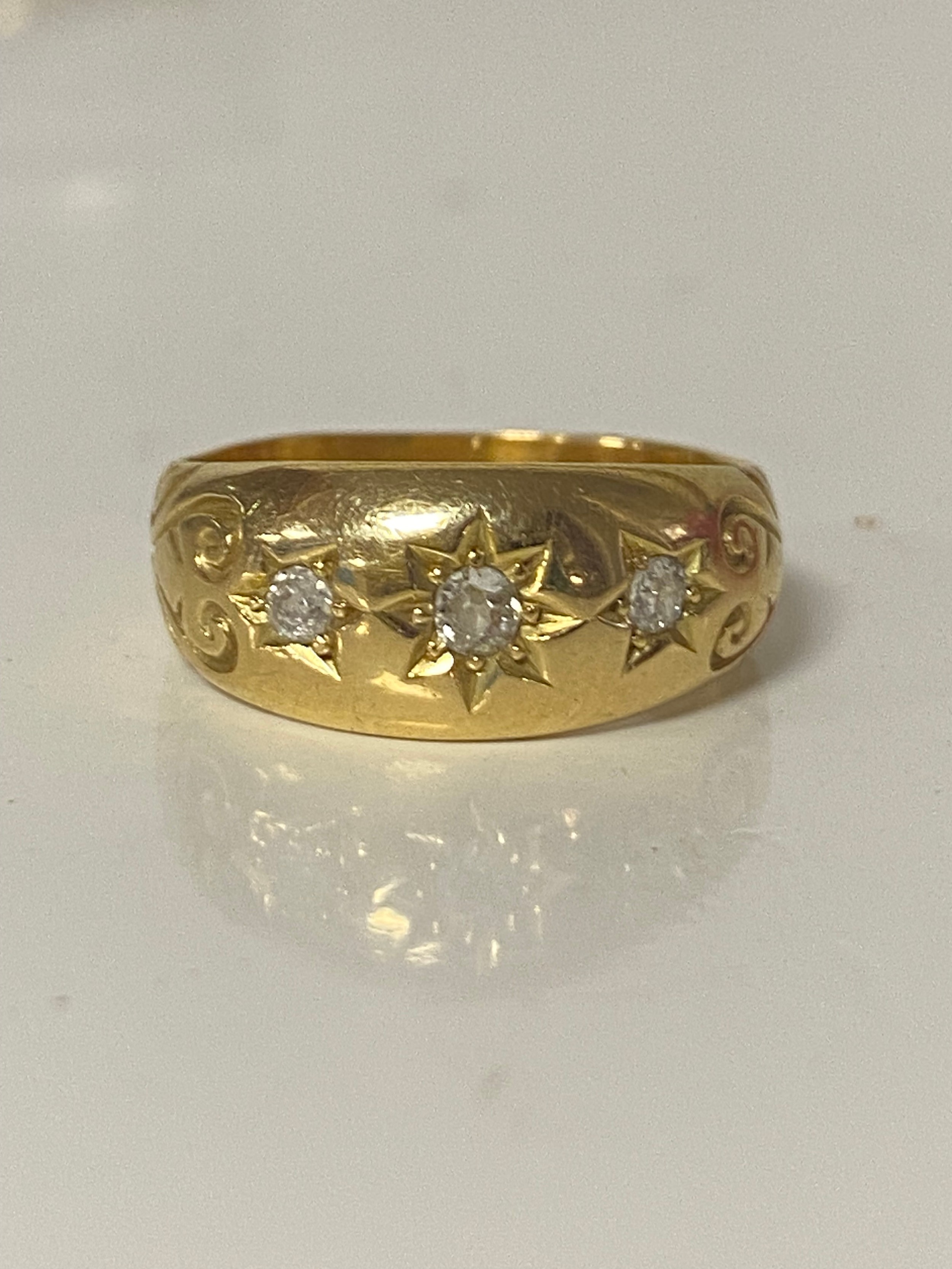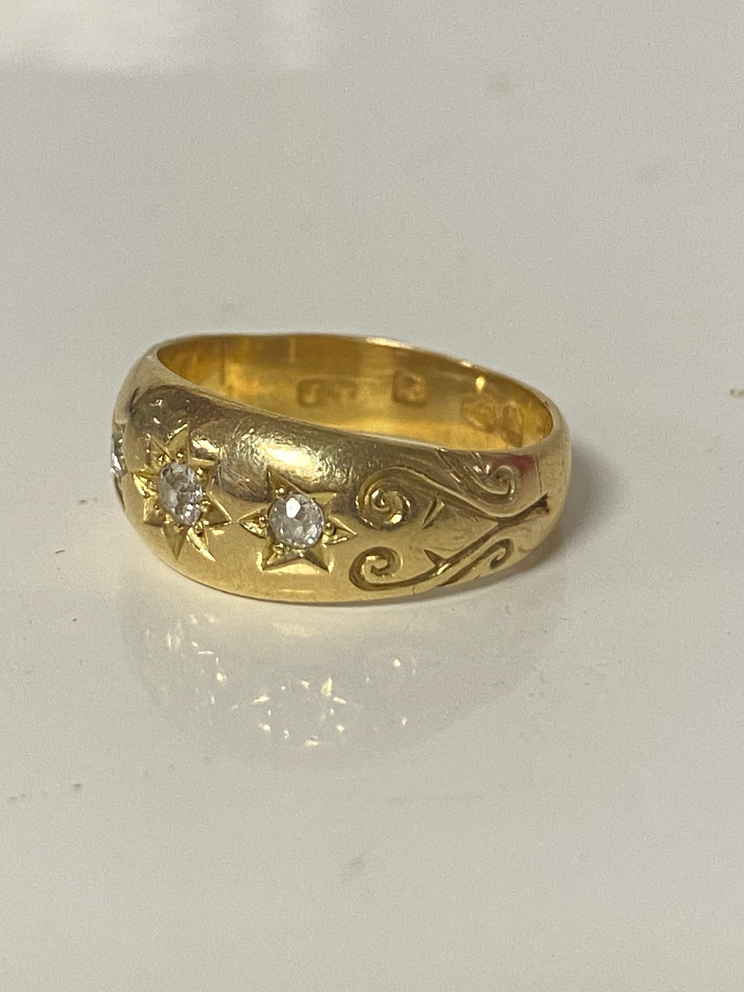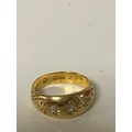 A late Victorian 22ct gold ring, gypsy set with three old cut diamonds between scrolled shoulders -