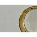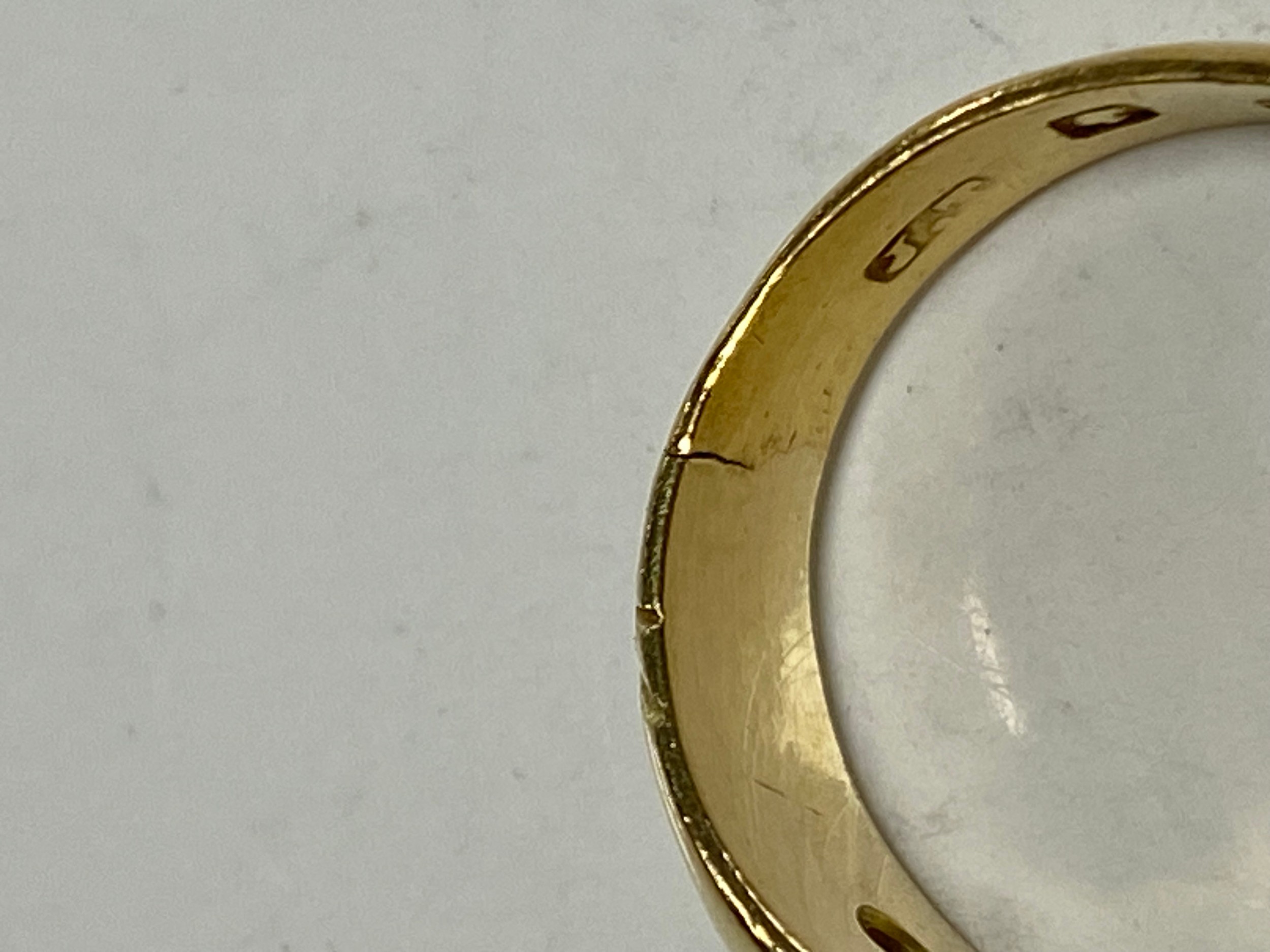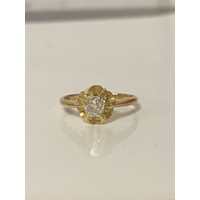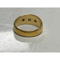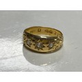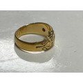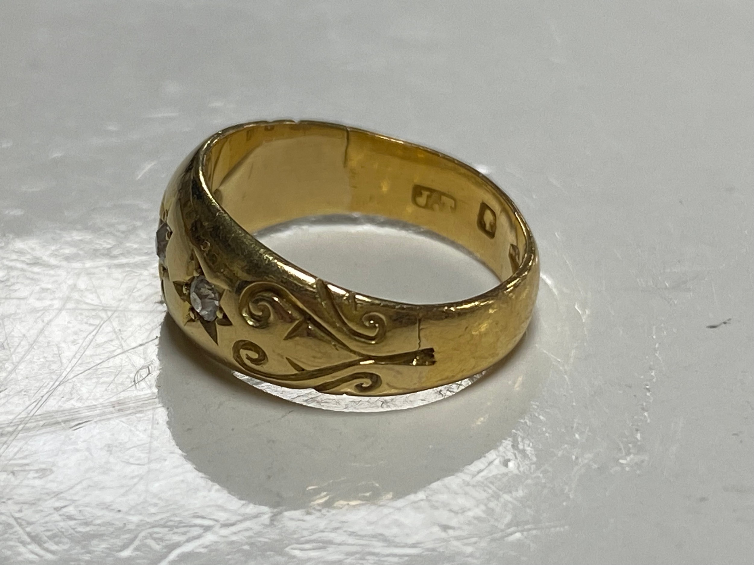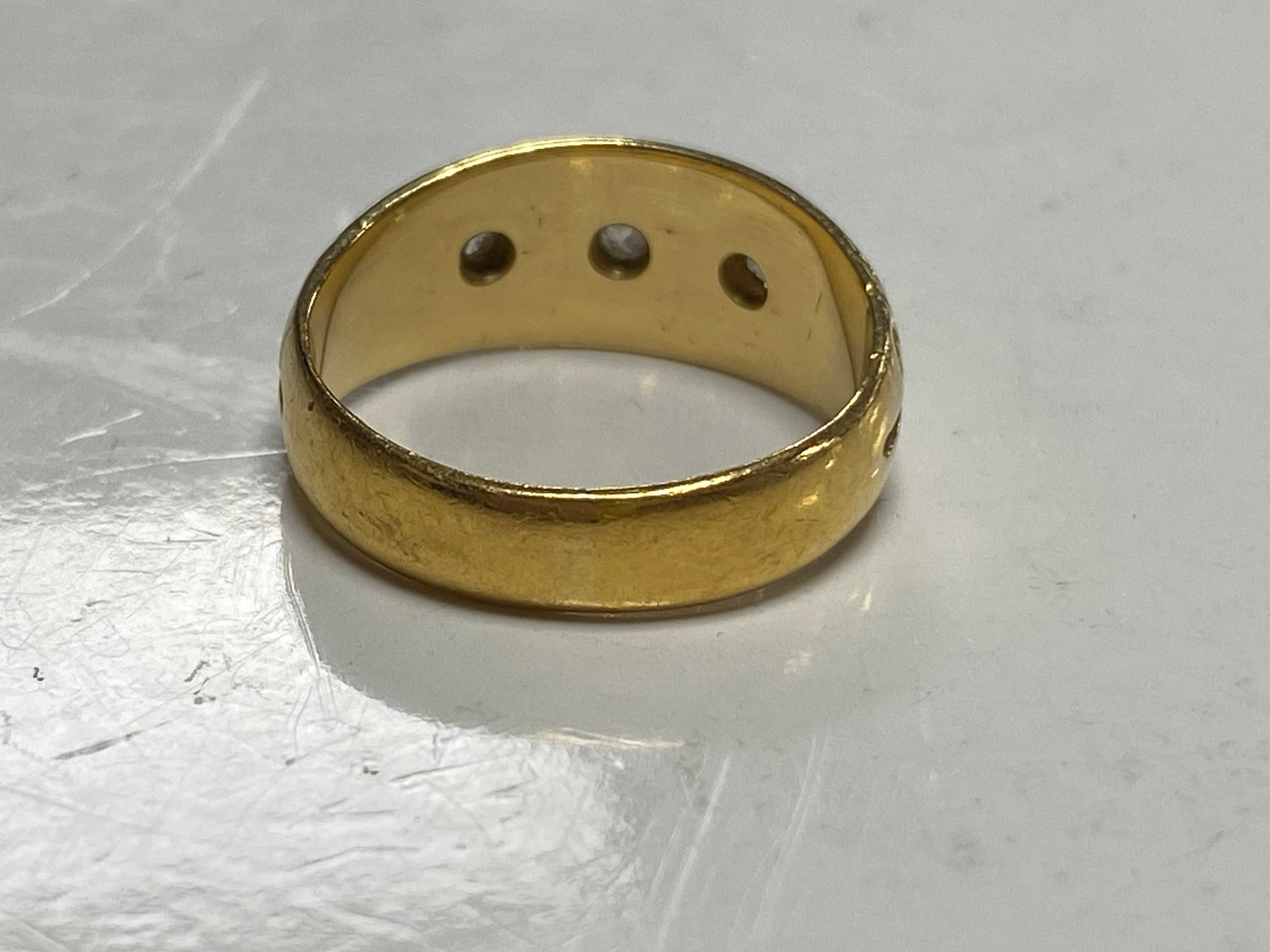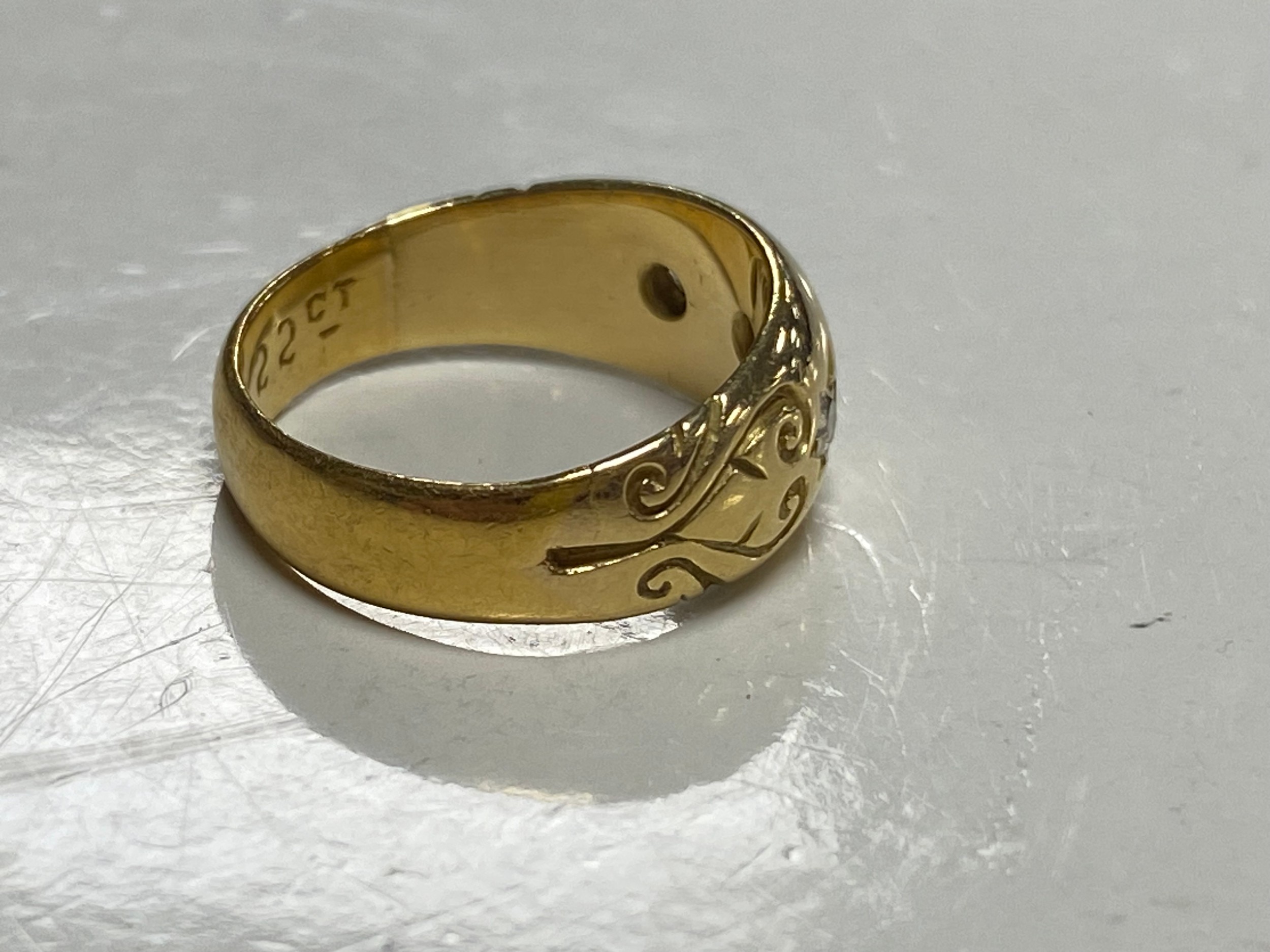 A late Victorian 22ct gold ring, gypsy set with three old cut diamonds between scrolled shoulders -