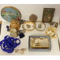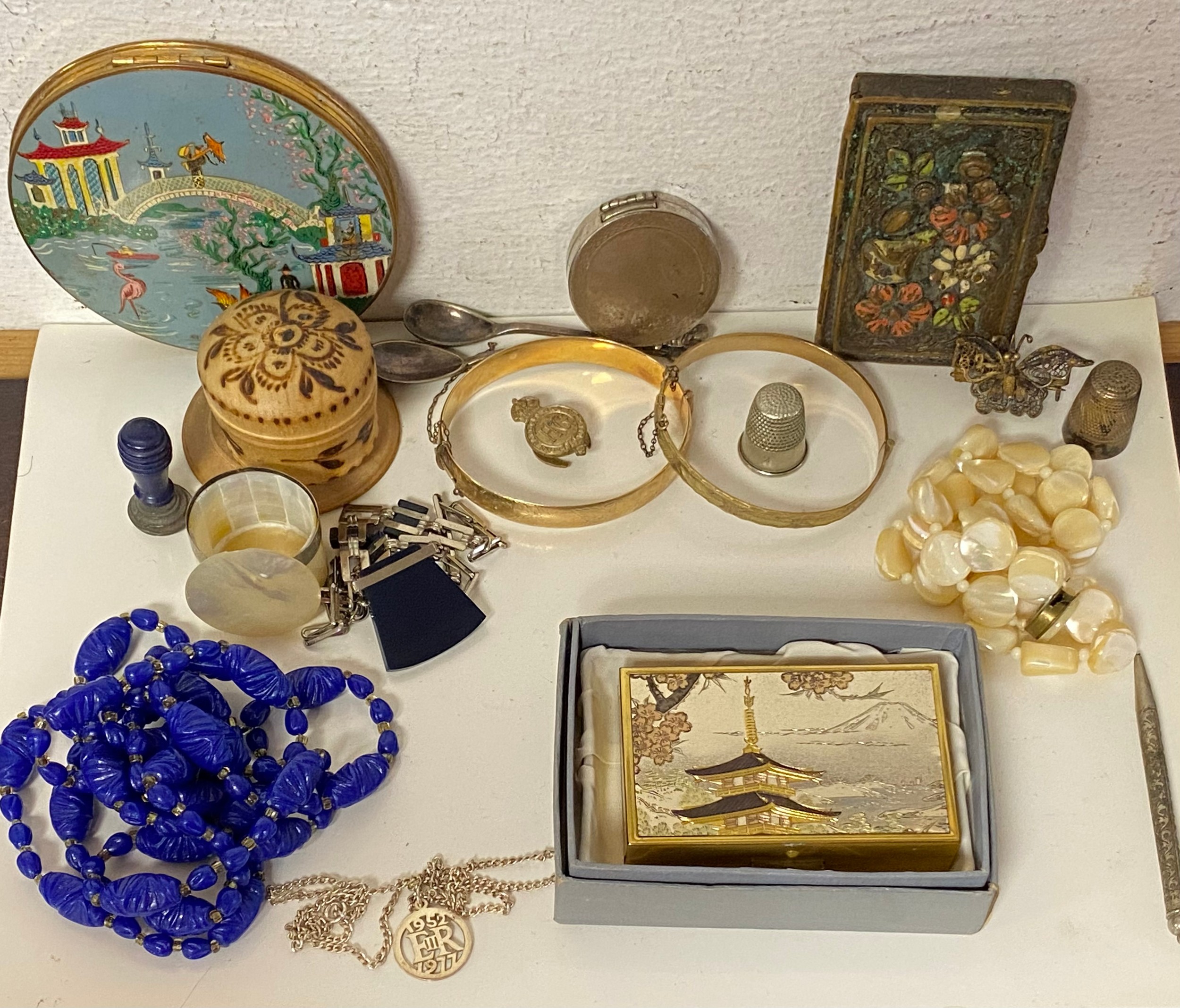 Two rolled gold bangles, together with a small quantity of costume jewellery, Clover and other compacts, etc -