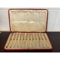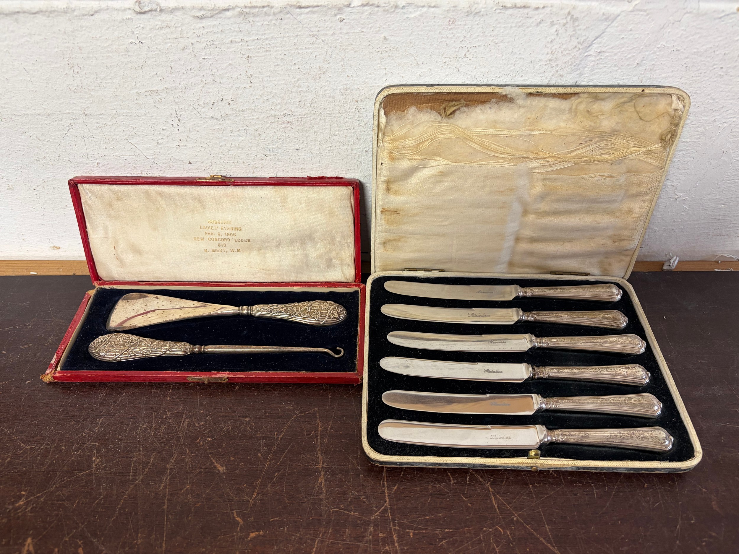 An Edwardian cased silver shoe horn and hook, Birmingham 1905, and a set of six silver handled knives -