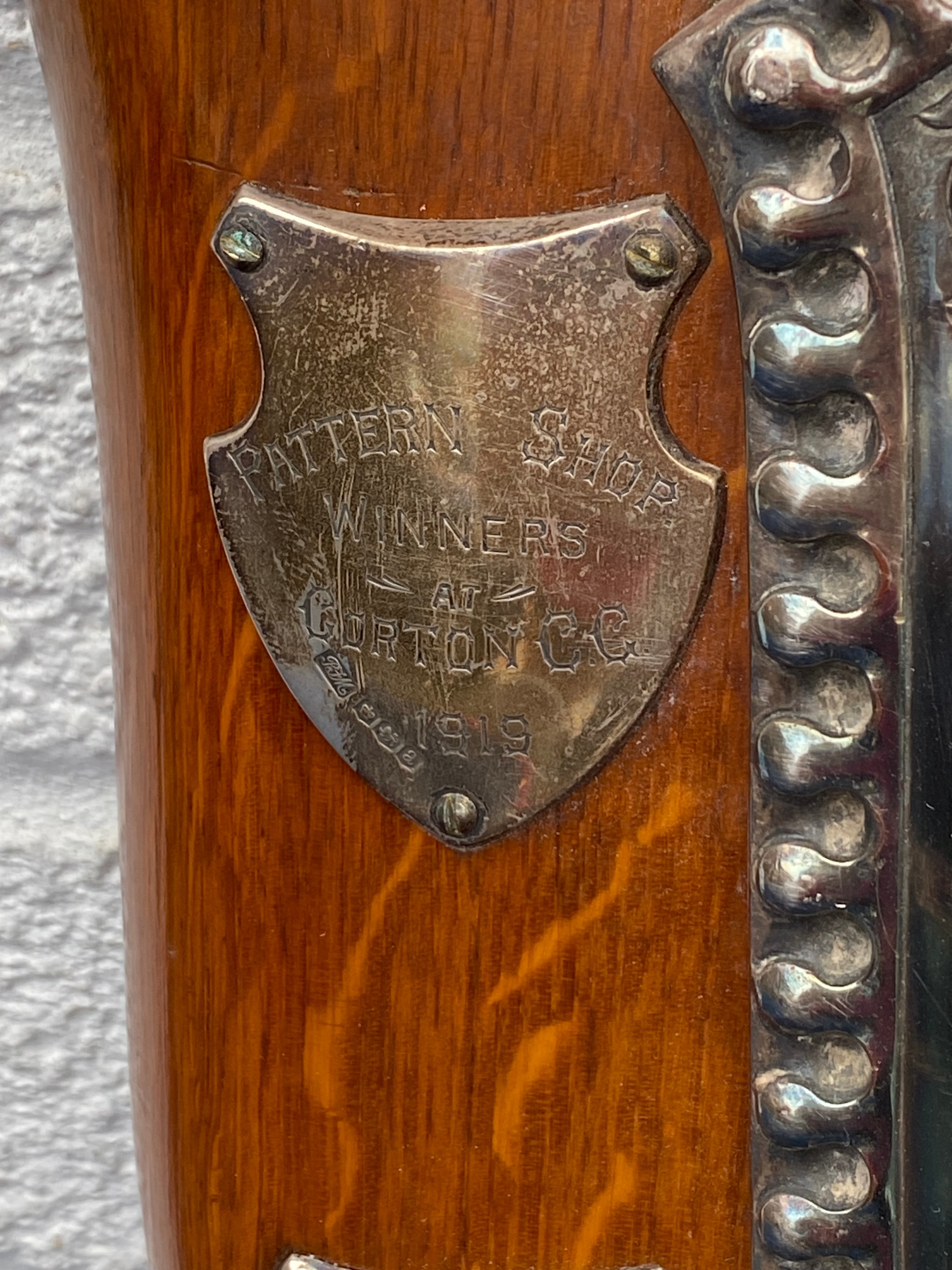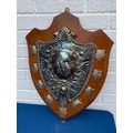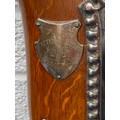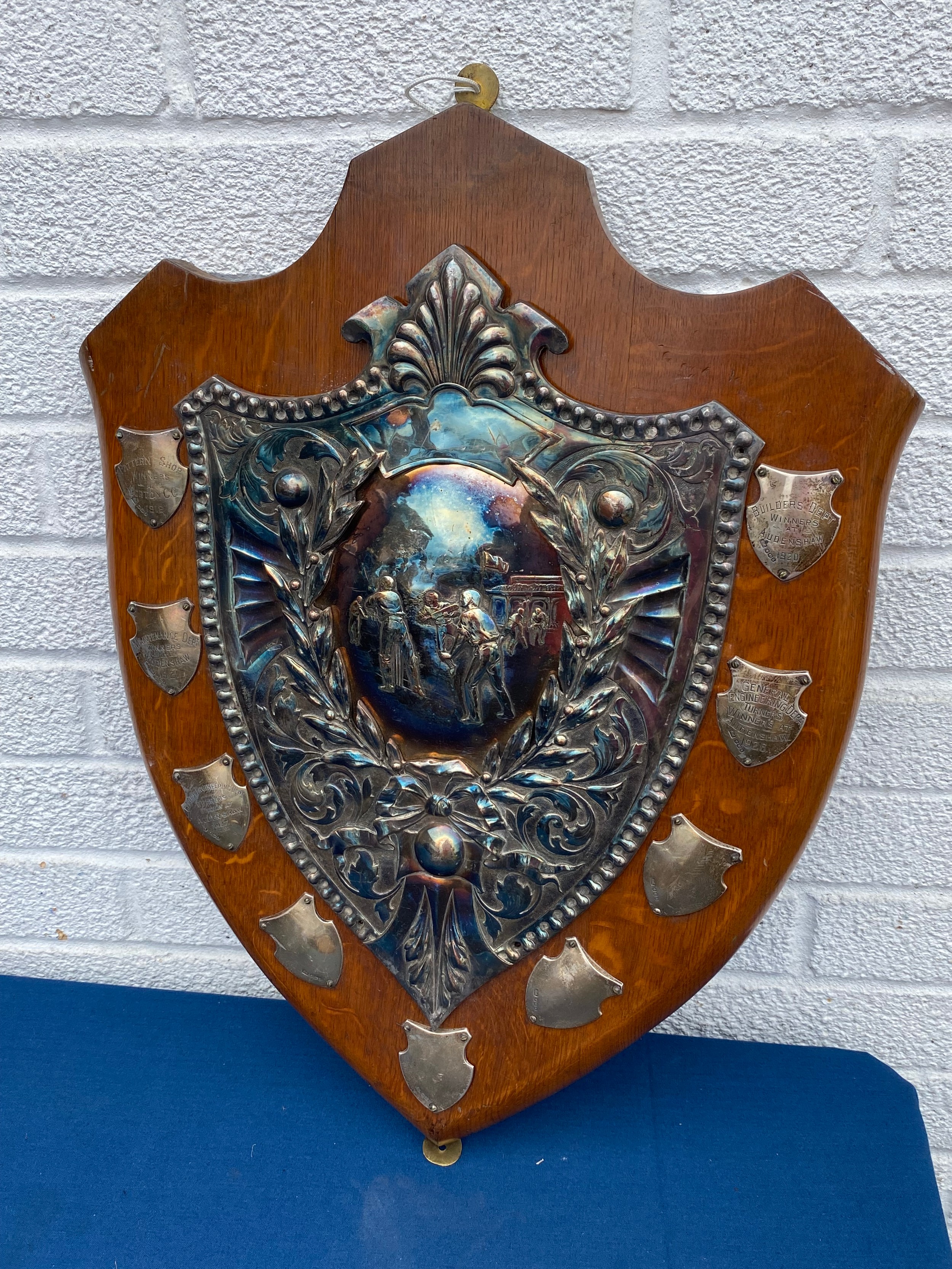 Of Cricketing Interest: An early 20th Century large trophy shield, set to the centre with large plated cricket scene applied with nine silver plaques, some engraved -