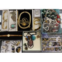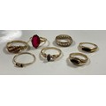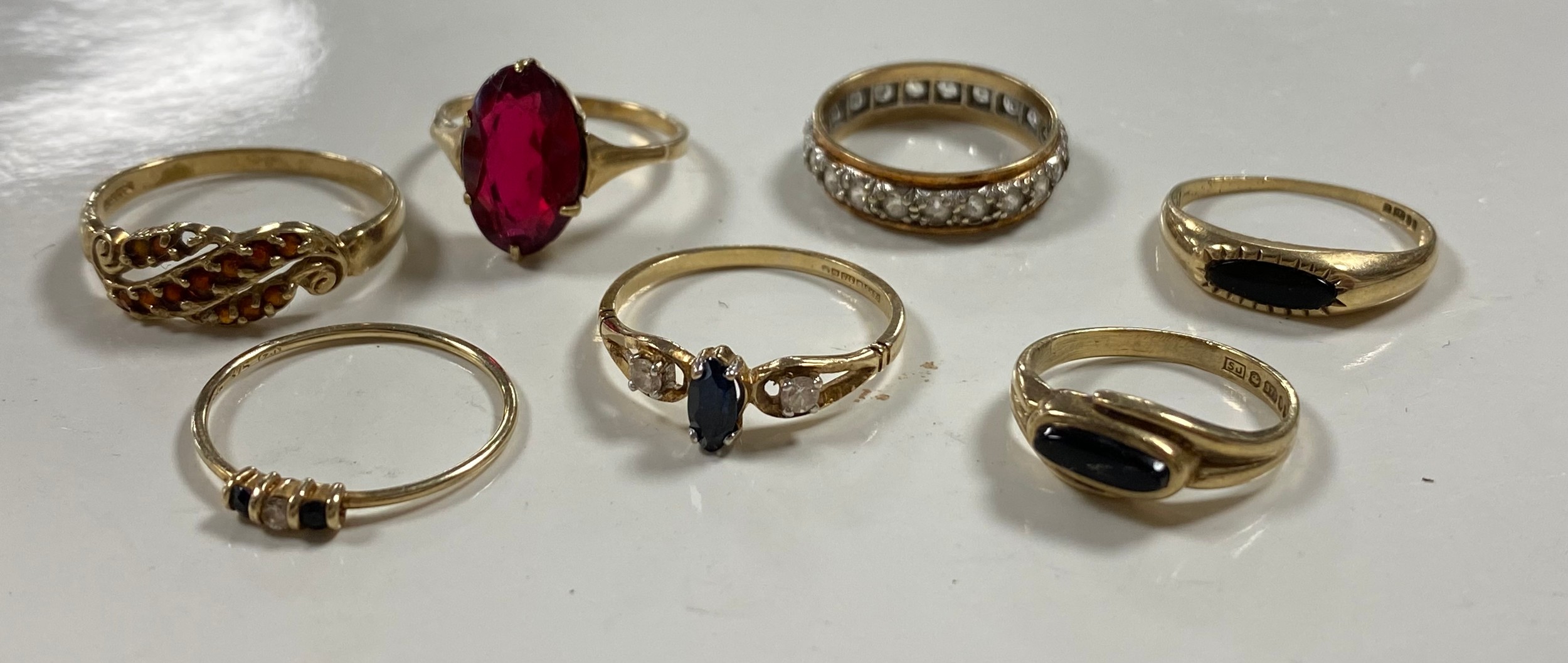 A group of seven 9ct gold rings, including a small sapphire and diamond three stone ring, and a garnet example (one stone deficient) -
