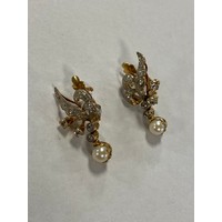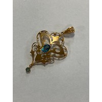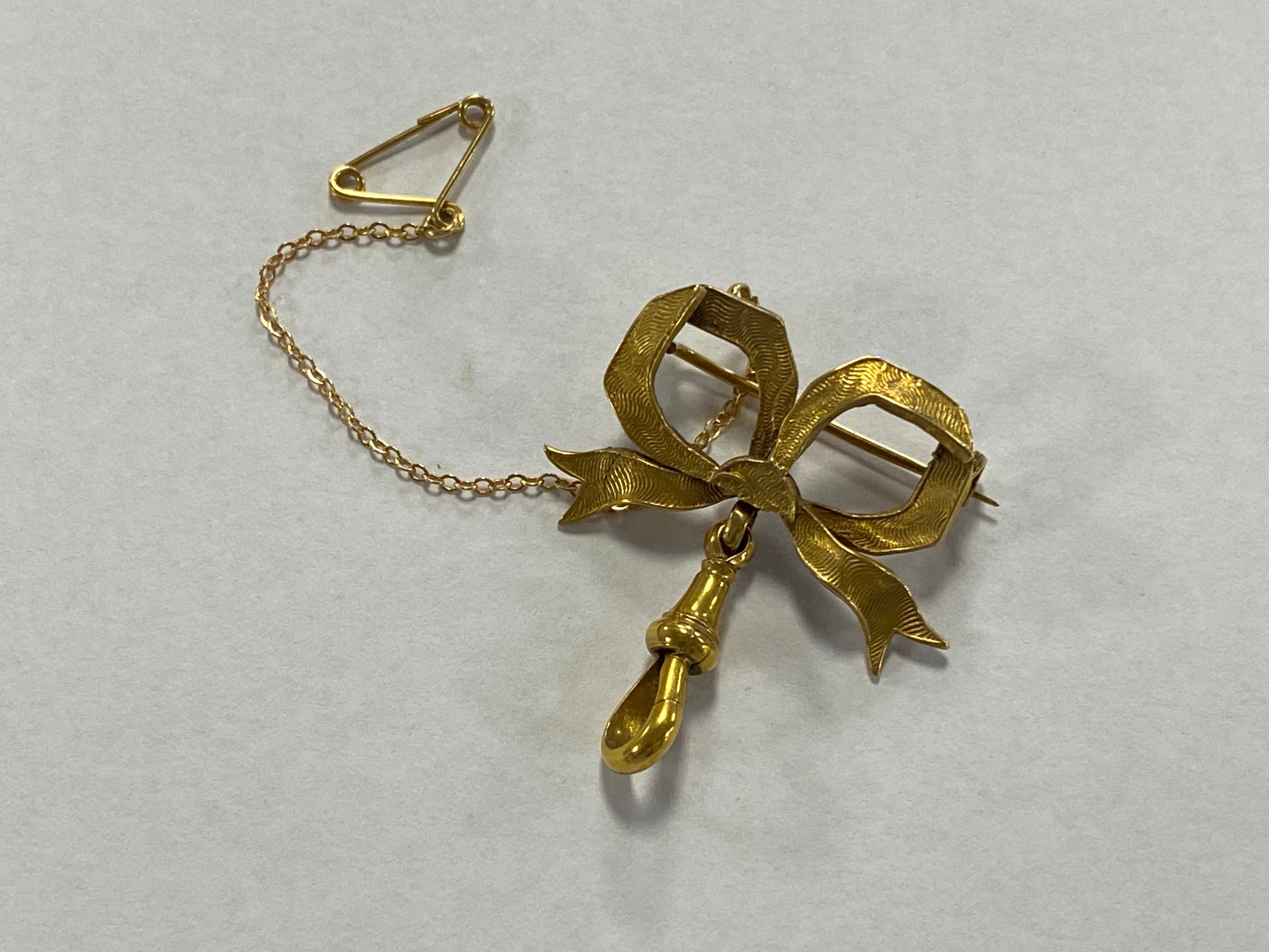 A 9ct gold bow brooch, of tied design, suspending a watch holder/dog clip -