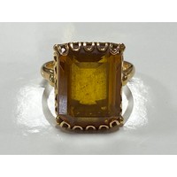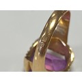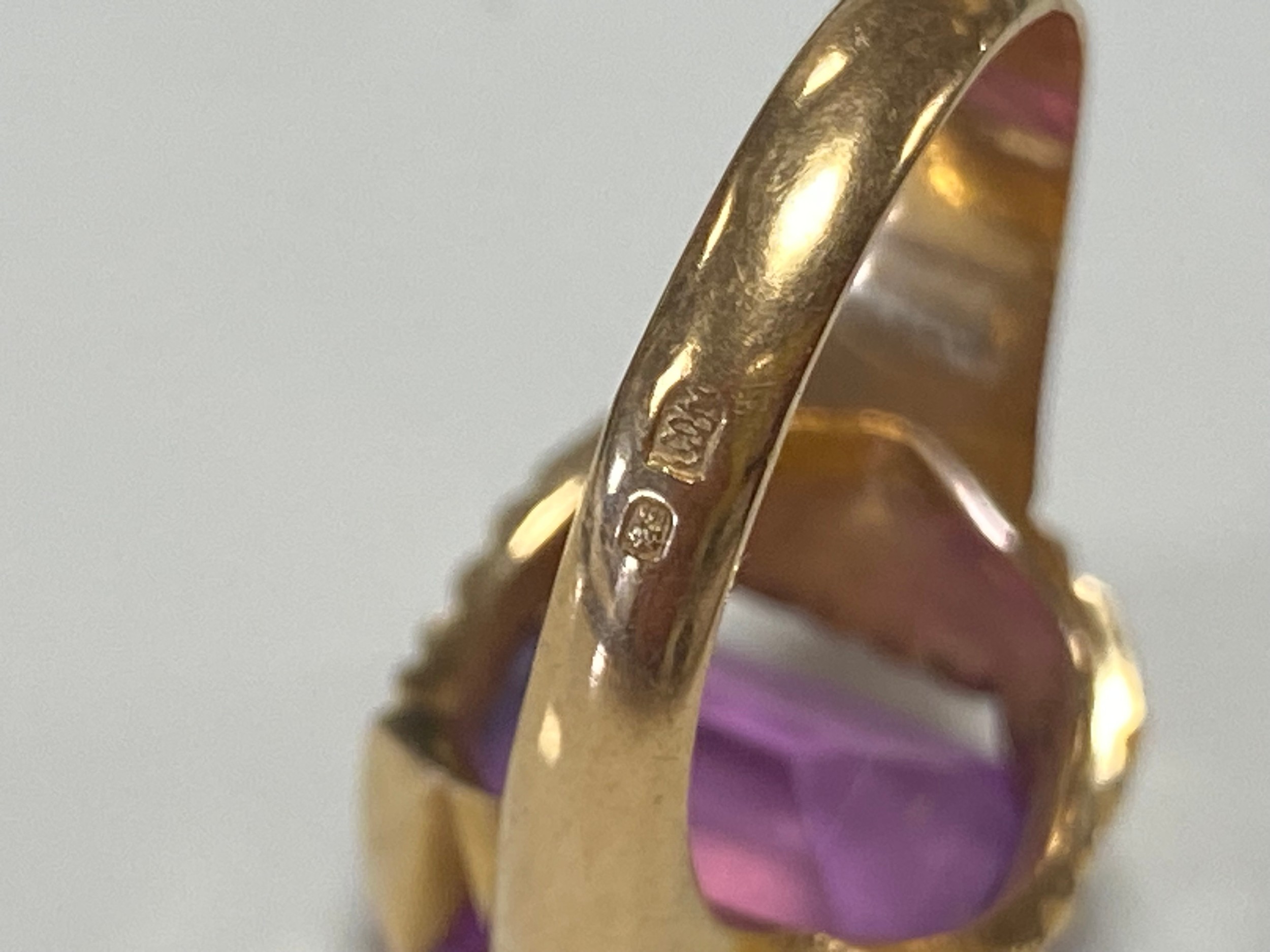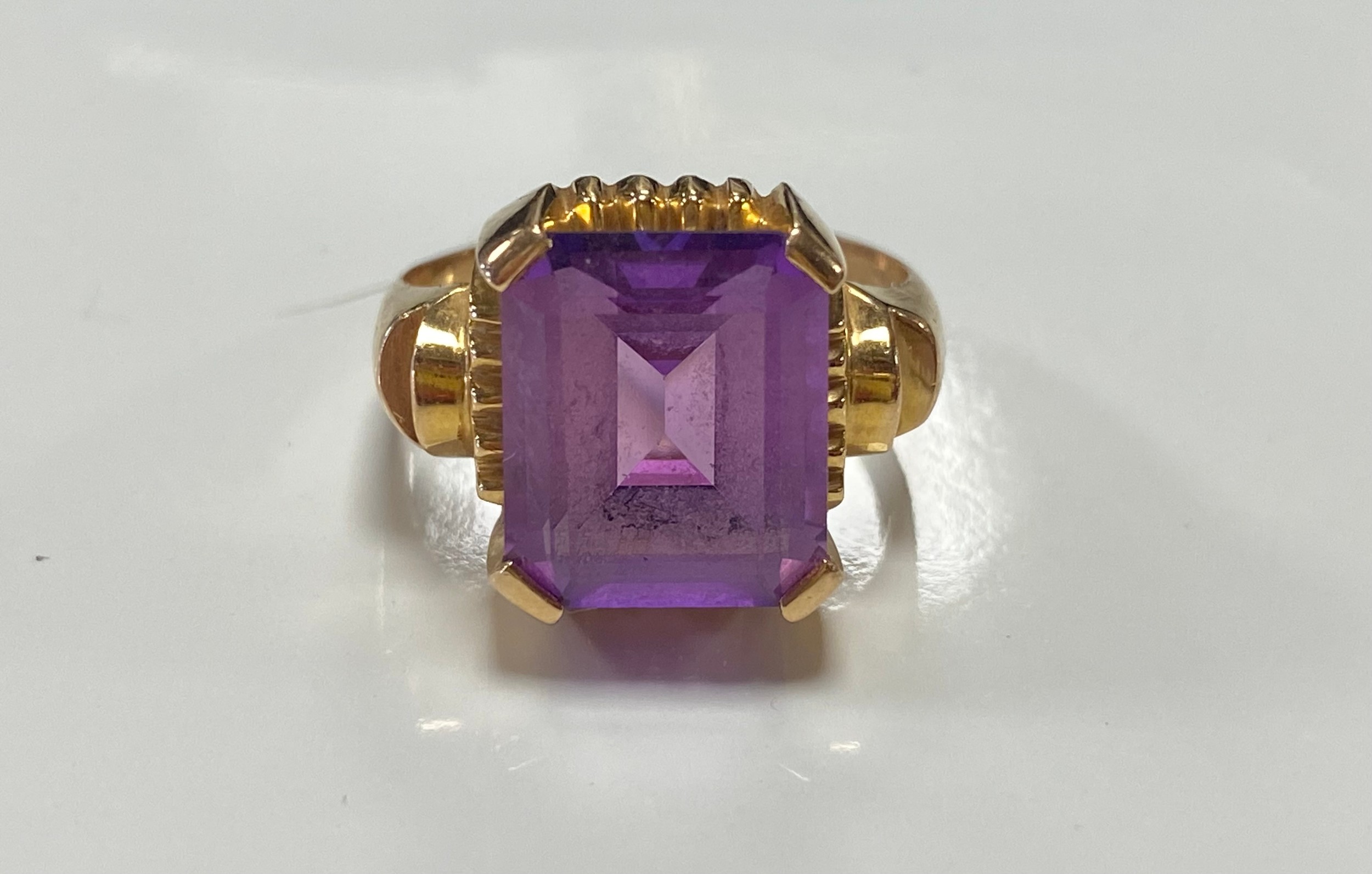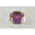 A continental yellow metal ring, set with a purple step cut gemstone, foreign control marks -